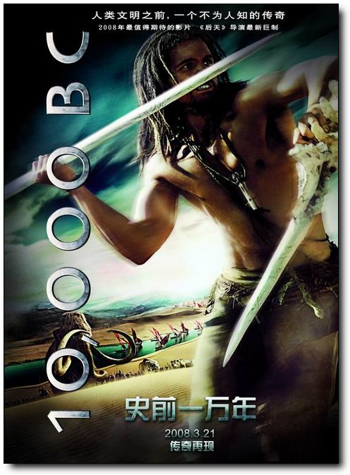 我承认这样的举止显得很不合时宜:白天回顾也就算了,却要在万籁俱静的午夜一个人屏声静气;一两年前的旧影也就算了,却那么认真的把2008年老片子当成经典……时间已经变成一个区别时尚和老朽的标记,时间已经在晨昏交接中已经被我慢慢颠覆, 《史前一万年》,让我回到另一个充满幻想的时间之端,导演:罗兰·艾默里奇,在这部电影上映一年之后,他导演的《2012》席卷世界,比《史前一万年》先看的这部灾难片也加重了人们对于末日论的恐惧和向往。