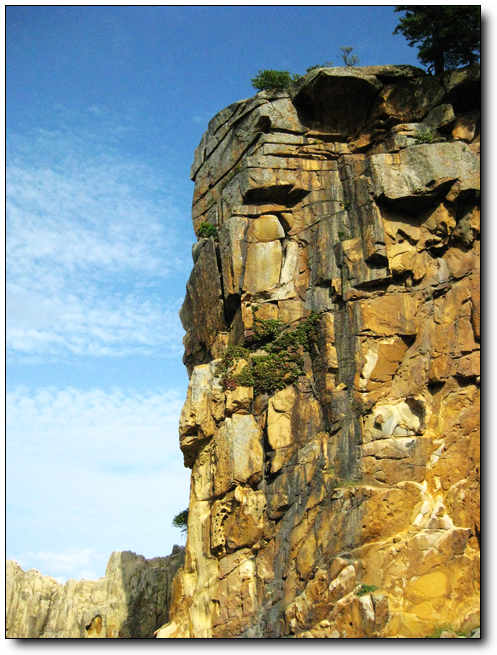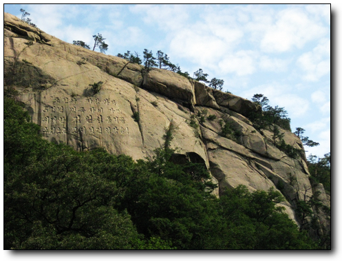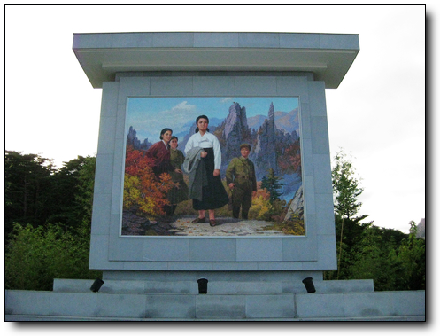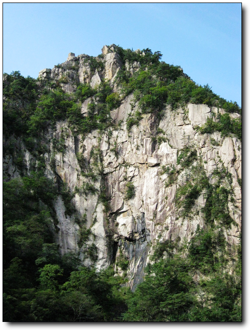 金刚山位于朝鲜半岛东部太白山脉的北段,在江原道东部,山体由花岗岩组成,主峰海拔1,638米,为太白山的最高峰。金刚山群峰峭立,相传有1.2万个山峰,众瀑飞泻,最大的九龙渊高达90米。森林郁苍,万石如林,层峦叠嶂,按照导游的说法,作为“山中之最”的金刚山,按季节不同享有各种美称:春天的奇景像纯净透明的金刚石,名为金刚山,夏季因它与蓬莱相媲美,名为蓬莱山,秋日漫山红叶如丹,名为枫岳山,冬天奇岩怪石,瘦骨零丁,名为皆骨山。这时节并非是绝美的秋季,没有层林尽染,没有红叶如丹,也缺少峡谷飞瀑,的确有些遗憾。