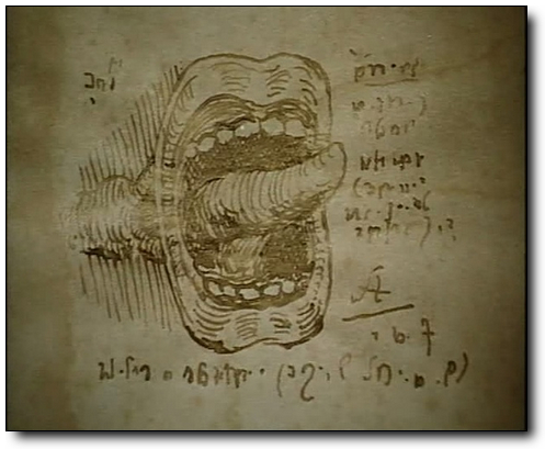 在镜子前用左手把现实变成艺术,这是属于莱昂纳多的日记部分,而当纸上的文明预言变成了赤裸裸的现实,人类只能用病态的眼睛看见自己的自画像,而所有的自画像只有一个结果,那就是毁灭:一枚从绘制的发射器里发射的炮弹,被魔鬼一样的人吞掉之后,又重新发射出来,于是这一张稿纸,终于被击中,然后变成纸团,然后燃烧成了灰烬。