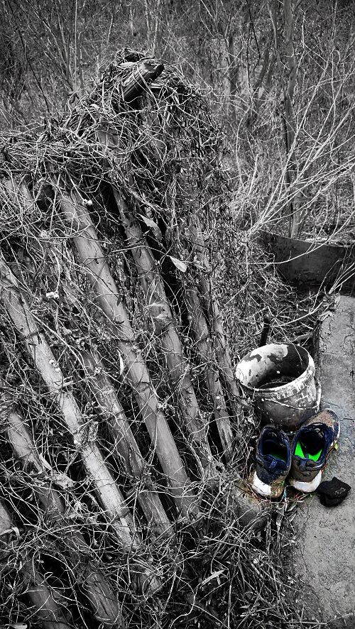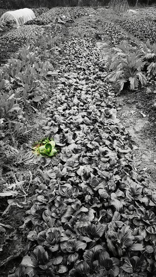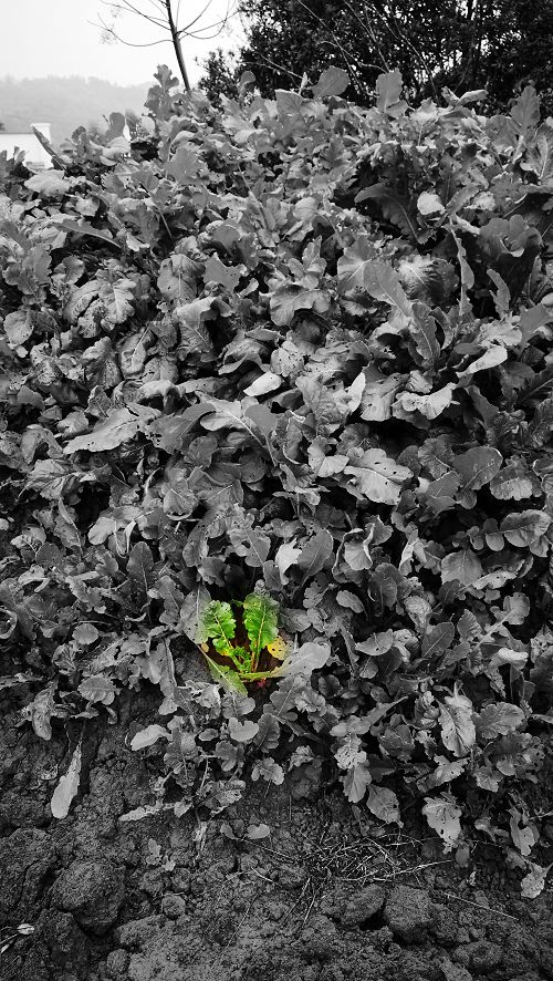 狗声传来,也是活着的象征,和不曾搬离的主人一起,成为这废墟世界里的符号。其实,在那堆砌的泥土上,不是还有茁壮成长的萝卜?在那田畈里,不是还种着青翠欲滴的青菜?它们被种植,也将被收获,一茬又一茬,一季又一季,鲜活着,泛出生命的光,也保留着主人培育的气息,虽然仅剩一点,但也是激活了有过的记忆,沉淀着生活的原味。所以,在这个被打开的冬季,在这个被命名的黑白世界里,它们的存在,就是最后的一抹色彩。