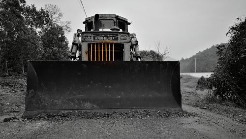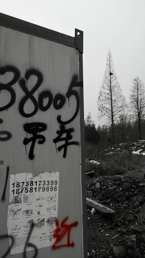 是的,隔了一年,那些流泪的人早已经背身而去,即使人声响起,也是零碎的,路上再不会留下脚印,砖石间再也不会放下目光,没有声音,没有影子,没有时间,一切以最单一的方式逝去。但是,在黑白的影像里,也必须留下一点彩色的东西:那靠山的西面还有两间平房,黑白的瓦片下住着还不曾走的人,从去年的冬天到今年的夏天,再到第二个冬天,他们见证了这里改变的一切。驻留在这里,却不再有夜晚的灯,和不再有避暑驱寒的工具,他们和白天的日光,黑暗的夜一起,还有一条白色的小狗——它总是坐在家门口,看没有经过的人,听寂静的声音,只是偶尔有车有人经过,它便吠叫着,唯一的声音,穿过平铺而没有障碍的废墟,穿过树枝间渐渐拉大的空隙,飘向远方,最后被那黑白的山,黑白的天所湮没。