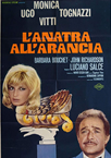 片名“橙汁里的鸭子”不是电影的主题,它只不过是一道美食,是利维奥邀请妻子的情人和自己的女秘书来家里聚餐时说起的一道菜,也是摆在桌子上供大家品尝的美食,卢恰诺·萨尔切借用这一意象似乎和主题无关,但是说起的美食和品尝的美食却成为利维奥扭转婚姻“战局”的一种方法:当他们品尝美食的时候,它是放橙汁和不放橙汁的区别,但是都成为现实一种,这种现实也是利维奥面对妻子背叛的现实,但是当这道美食被说起时,它却构成了回忆,因为这是他们相遇相识之后第一次用餐时点的美食,橙汁里的鸭子不仅是美味的代名词,也是浪漫爱情的见证,而面对现实的窘境,美好和浪漫的回忆所激发的情感共鸣也成为利维奥挽救妻子的最有效手段。