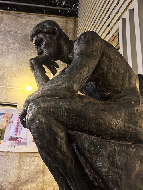 《沉思者》还在沉思,十字架还立在天堂的入口,“大地上的异乡者”还在寻找着故乡,但是为什么店门口“先锋书店”的招牌不见了?据说招牌是不久前拆掉的,按照官方的解释是为了装修的需要,但实际上书店正常营业并无暂停式的装修,当里面还在营业,招牌处的空无就可能是另一种解释。在斜坡的入口处,立着一块关于“禁止拍立得、商拍的公告”,公告上说为了维护书店秩序及阅读环境,禁止使用拍立得,禁止开启手感光,禁止使用三脚架等辅助摄影器材,通道中请勿长期停留摆拍,同时禁止商拍商家入内……这一公告的落款时间为2026年6月23日,距今四个多月。公告上面列举的内容或者“禁止”或者“请勿”,拉下面孔或者好言相劝,虽然口气不同,但是实质一样,那就是以禁令的方式维护这里的秩序,还书店一个安静的空间。