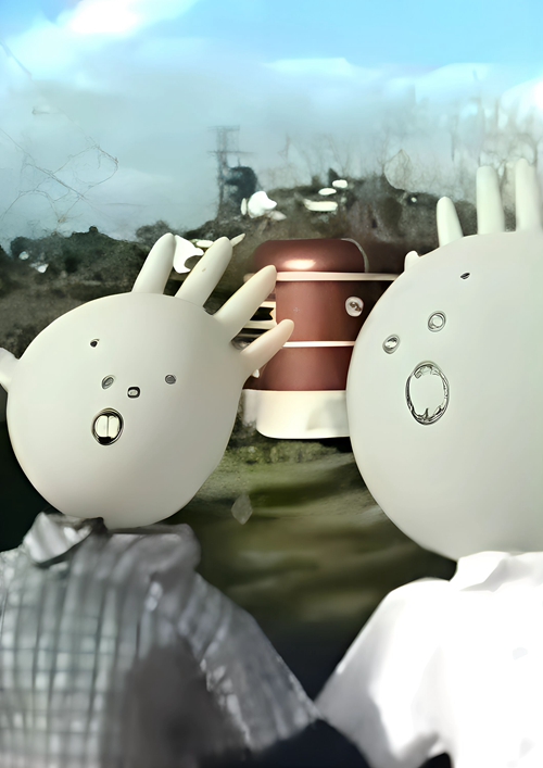 两只白色气球,被画上了眼睛和嘴巴,被装饰上了可爱的耳朵,被穿上了格子衬衫或白色衬衣,在被掩藏于衣服中的支撑物作用下,它们完成了“变形记”:它们在镜头前不安分地跳动,它们发出了怪异的声音,或者独自在那里发声,或者转过头来对话。